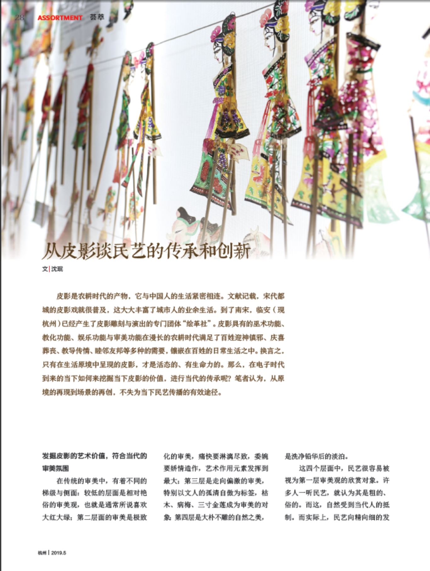 2016年,获得杭州社科项目立项,进行皮影原境研究。发表论文《从皮影谈民艺的传承和创新》(《杭州》 2019(5))、《盘活民艺,增进民族文化的自信力——以皮影为例的说明》(《中华老字号》2019(6))