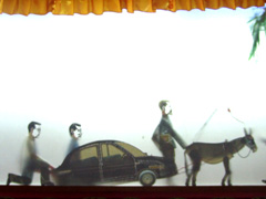 此剧以著名笑星赵本山的小品为原形,以音配像的方式将小品改编成皮影,将舞台上不能表现的车、驴都以皮影的形式来体现,更加生动诙谐,让小品中的故事更加完整。皮影人物赵本山、范伟的皮影形象逼真。很受观众欢迎!