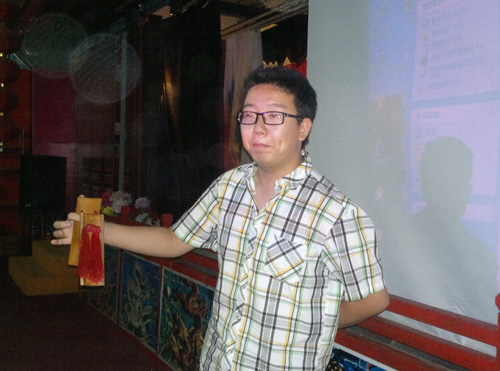 目前龙在天有一个“快板四小龙”组合,他们是袖珍演员鲁德峰、金本发、王永跃、韩健,在剧团副馆长李治和先生的指导下,演员的快板表演已有雏形。为了更好的加强他们对加板的技艺,影人姐姐专门请来了“李瑞杰”杯快板比赛一等奖获得者郭洪斌先生,来加强袖珍演员的快板表演。郭老师是一位年轻的快板演员,听说要给袖珍演员们讲快板,他非常认真的准备了PPT,从快板的理论到实践,生动有趣的给大家讲解,使快板四小龙大开眼界,知道了艺术无止境,从心里里派服这位年轻的老师。团里除快板四小龙外,还有其他喜欢快板的演员旁边了郭老师的讲解。非常感谢郭老师的爱心,在以后的日子,他将成为龙在天袖珍人皮影剧团的快板老师,指导他们快板的表演。