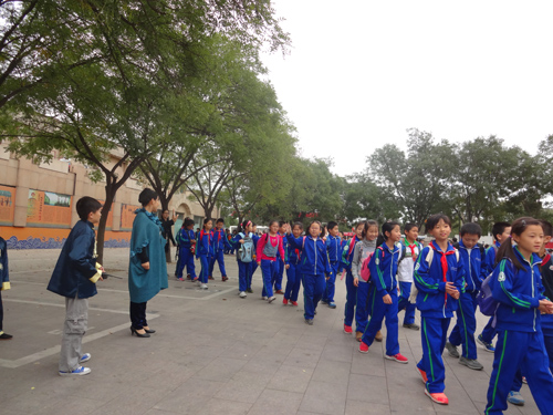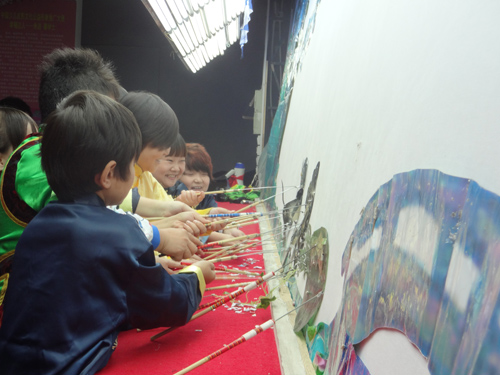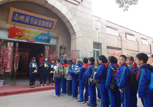 演员还教他们跳起了皮影舞蹈,近三百学生,演出厅放不下,干脆到门前的停车场,使秋日的午后成为圆明园一道独特的风景!