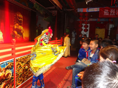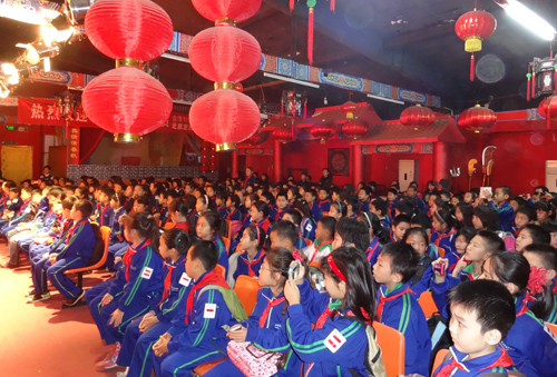 同学们每个班排队进入龙在天皮影馆,袖珍皮影演员每三人一组做每个班的皮影导游
